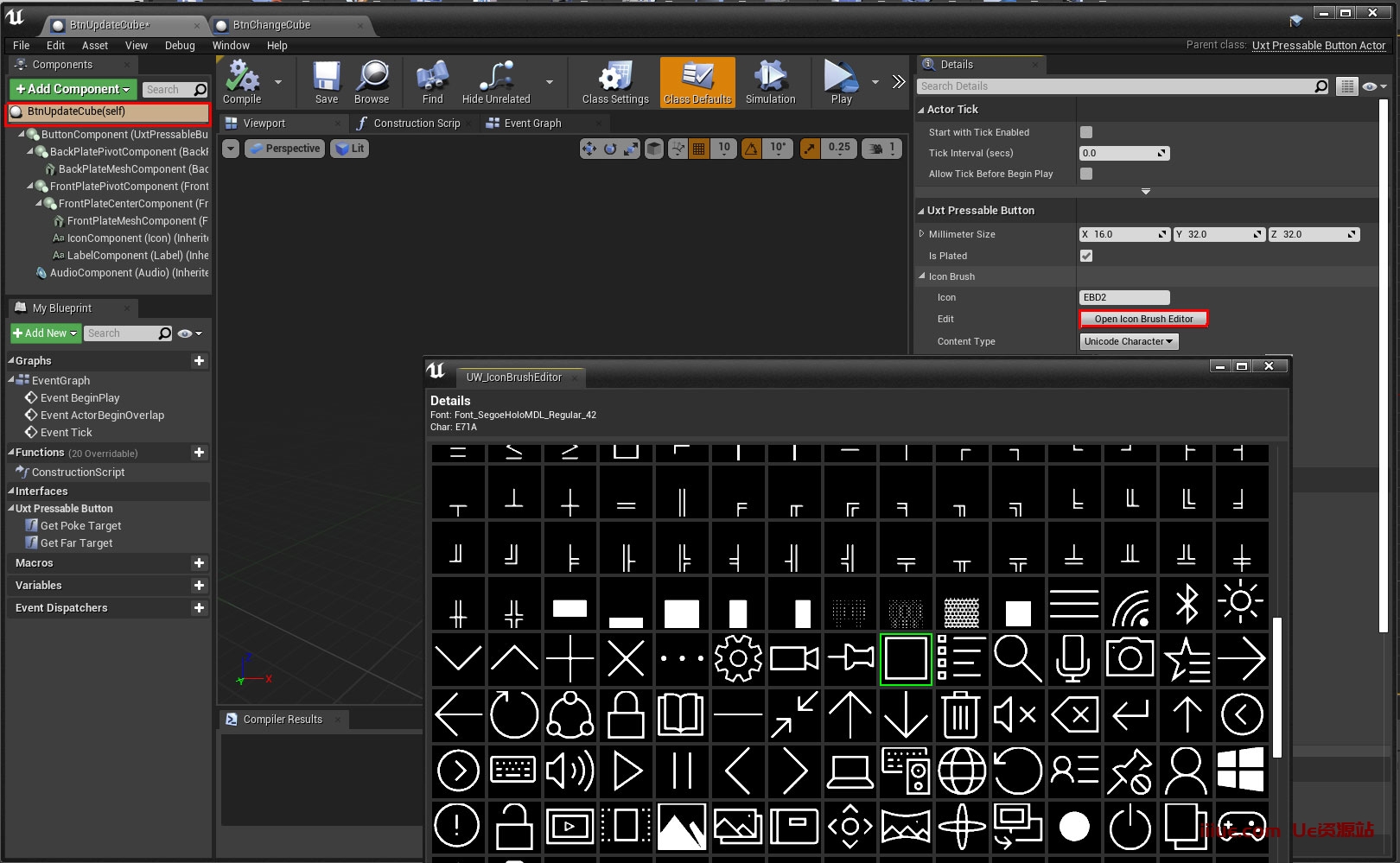 确保在“组件”面板中选择了 BtnUpdateCube(self),然后在“详细信息”面板中向下滚动到“Uxt 可按下按钮”部分,然后展开“图标画笔”部分。您可以滚动浏览并选择您喜欢的任何图标。