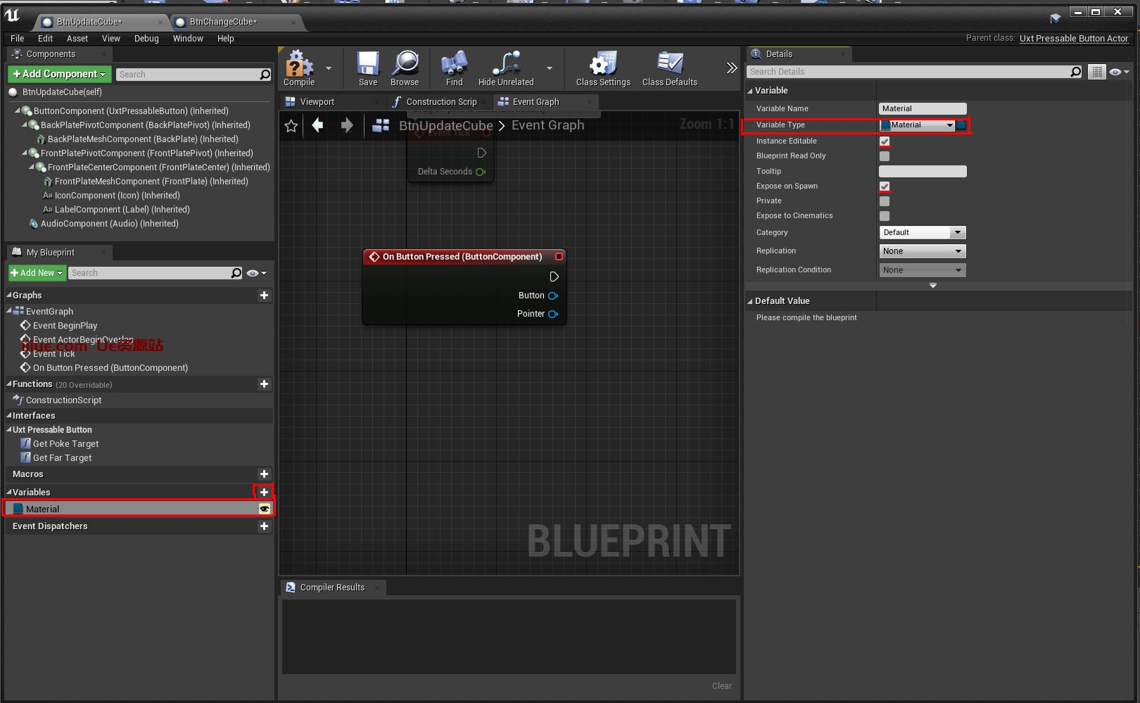 转到“我的蓝图”面板,然后向下滚动到“变量”部分。单击 + 以添加变量。将其命名为“材质”,然后转到“材质”节点的“详细信息”面板,单击“变量类型”下拉列表,搜索“材质”并选择蓝色的“对象参考”选项。