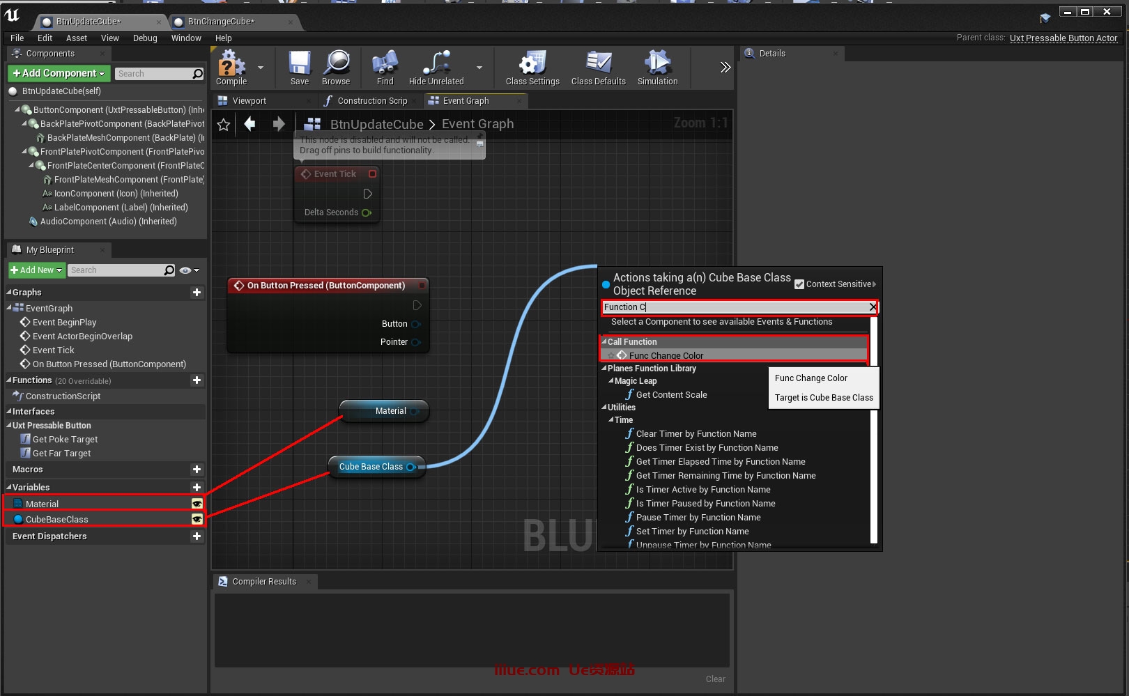 现在单击并拖动以将按钮按下的引脚连接到功能更改颜色引脚。编译并保存e.
