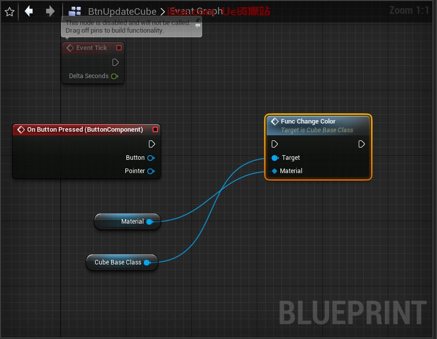 现在是时候进入函数事件图了。左键单击关闭引脚并创建新的“设置材质(立方体)”节点。