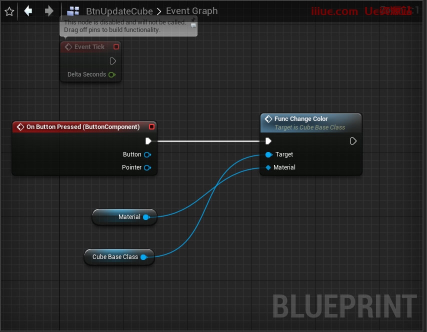 现在单击立方体引脚并将其拖动到设置的材料目标引脚上,以将立方体指定为要更改材料的目标。