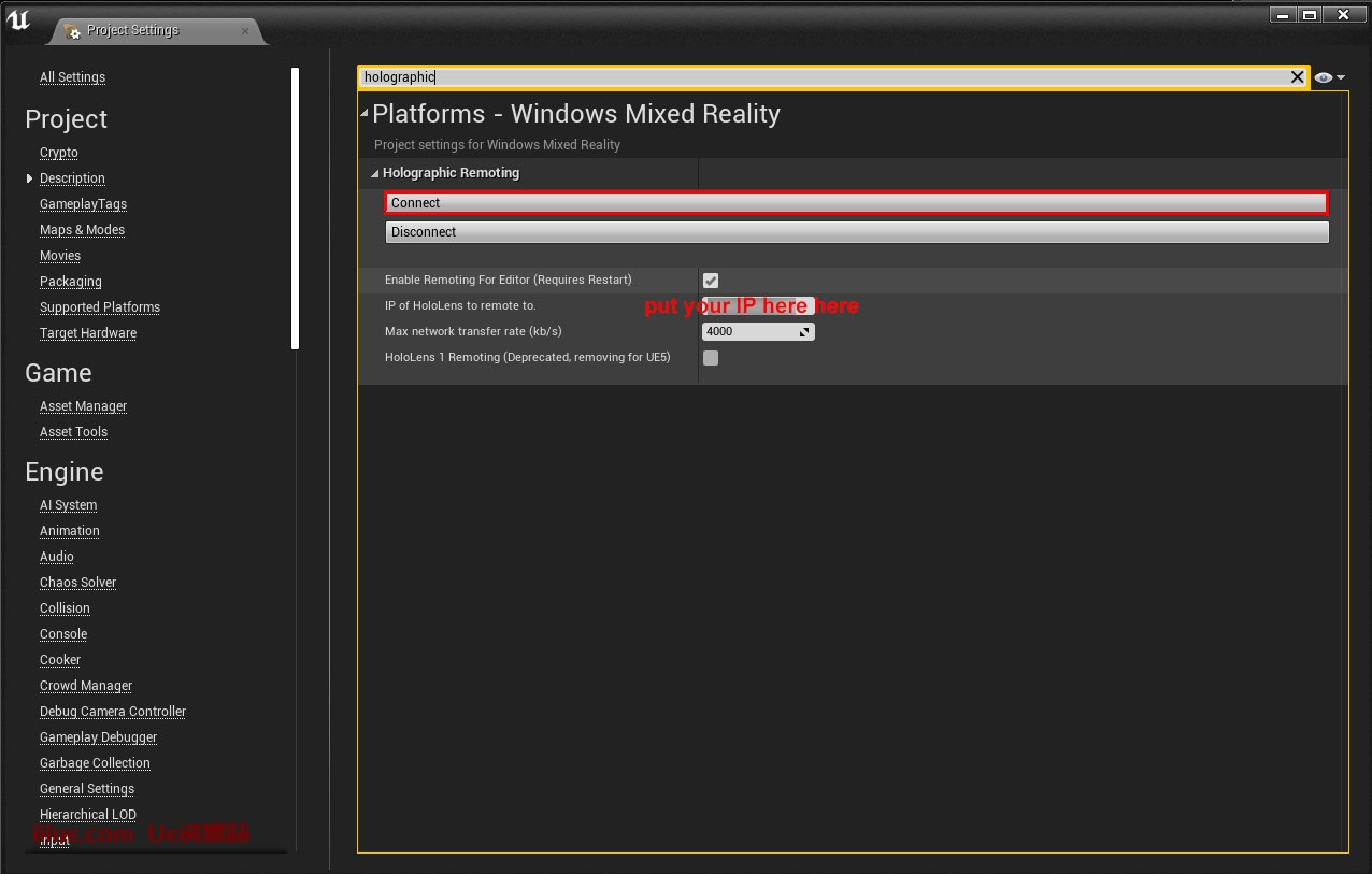 然后进入虚幻项目设置,搜索全息以调出连接面板。将您的IP放在我向您展示的位置,然后点击连接。
