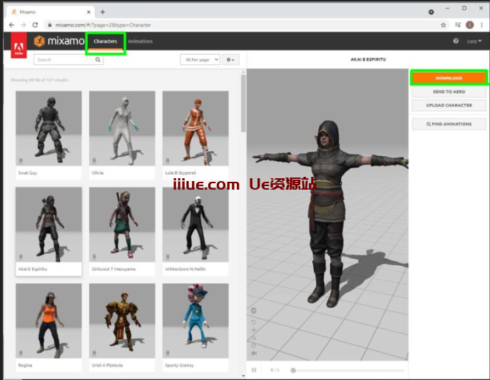 您将在页面顶部看到两个选项卡。角色和动画。 首先进入“字符”选项卡,搜索庞大的数组,直到找到自己喜欢的内容。然后只需单击右上角的橙色下载。