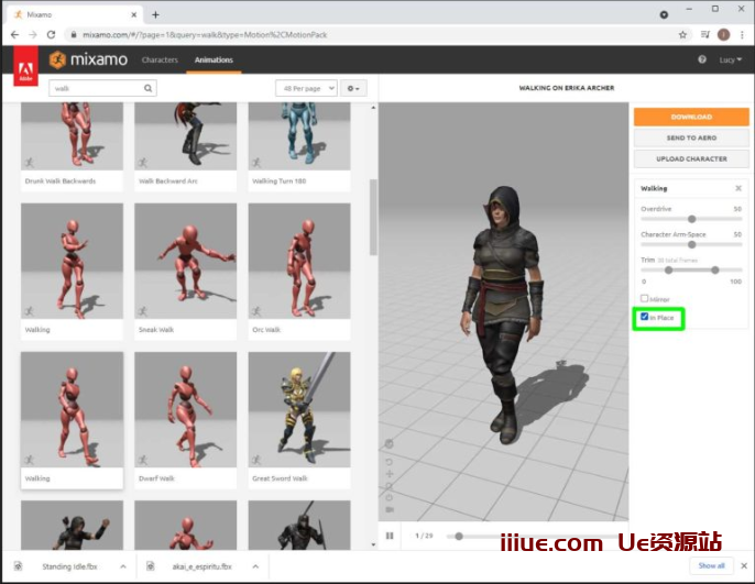 不过,当你在虚幻引擎中使用角色时,你几乎总是希望使用自己的代码控制角色的位置,所以你需要在下载前选中“就地”复选框。单击它后,您将看到差异。