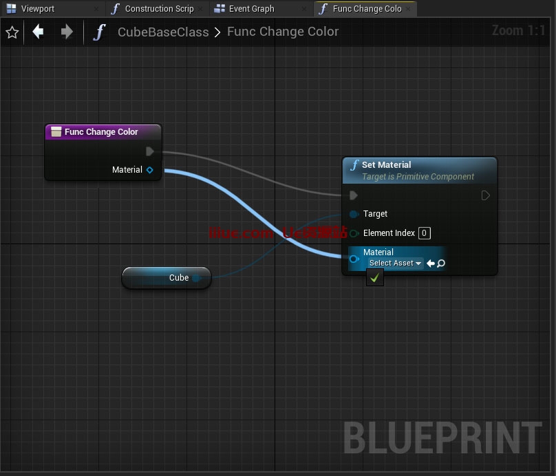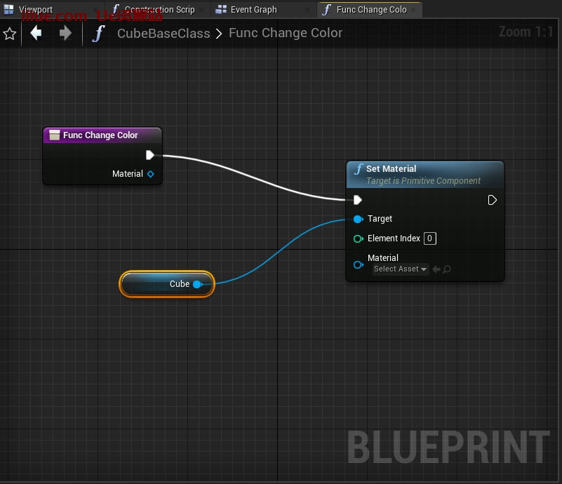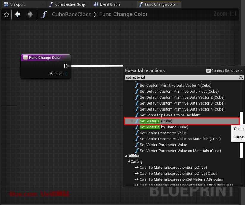 现在是时候进入函数事件图了。左键单击关闭引脚并创建新的“设置材质(立方体)”节点。