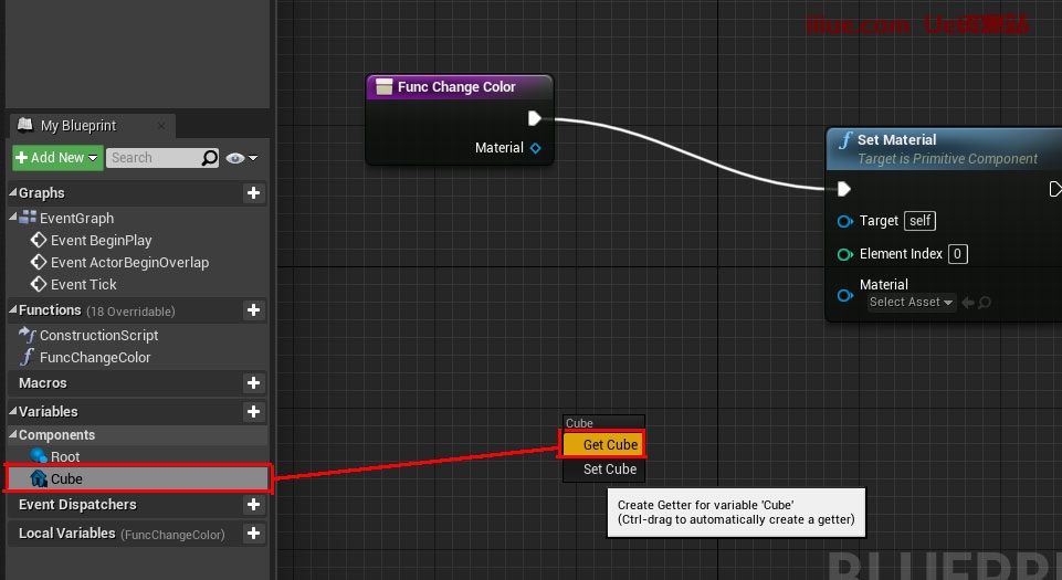 现在单击立方体引脚并将其拖动到设置的材料目标引脚上,以将立方体指定为要更改材料的目标。