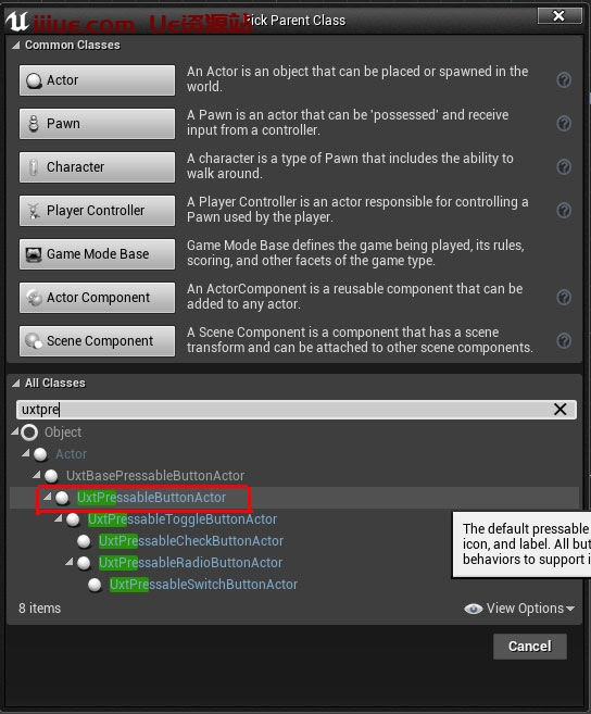 在内容窗口中,选择添加新>蓝图类,展开所有类部分,然后搜索 UxtPressableButtonActor。称之为BtnUpdateCube并双击打开。