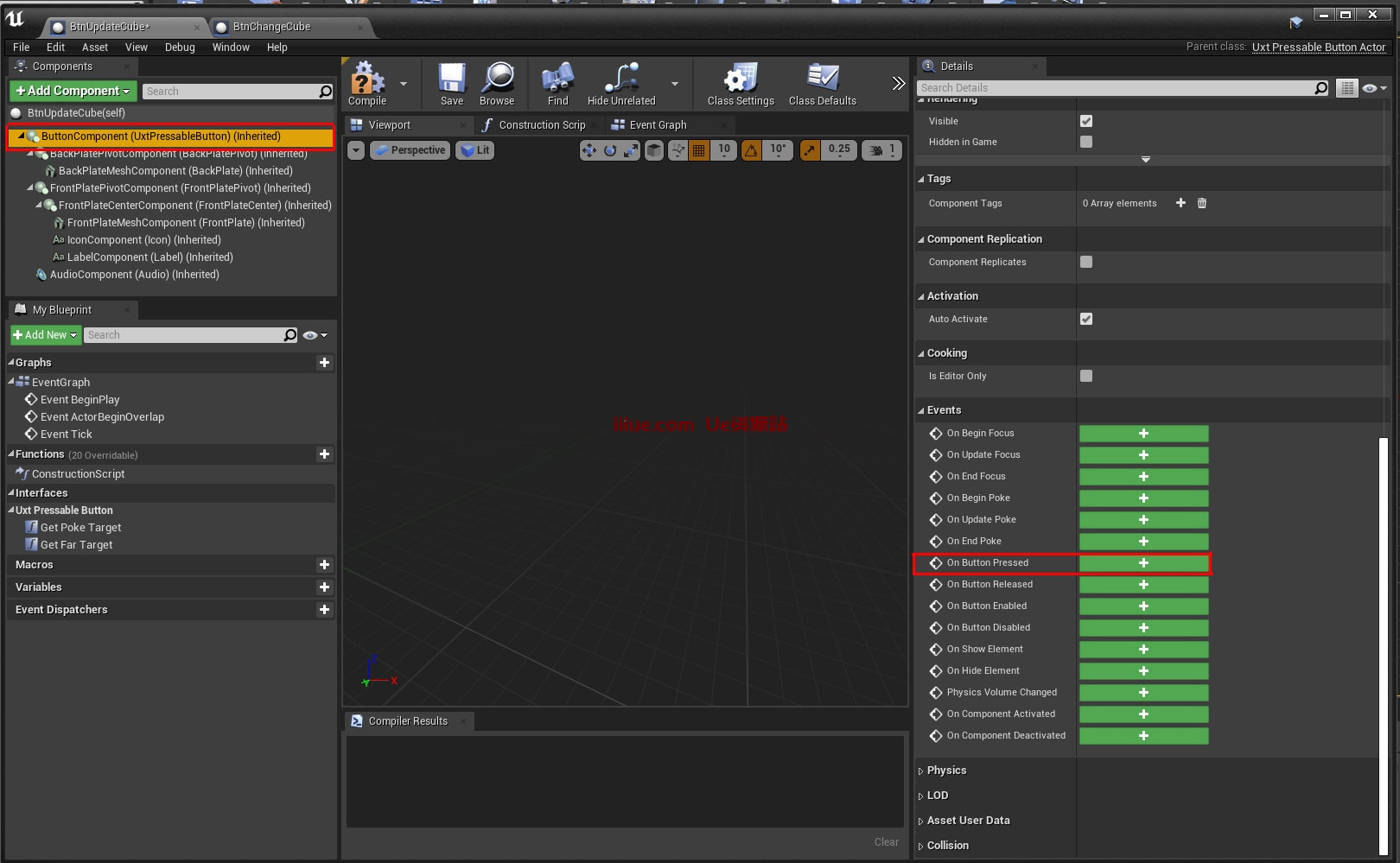 现在返回到“组件”面板并单击“按钮组件(UtxPressableButton)(继承)”,然后将“详细信息”面板向下滚动到“事件”部分。单击按下按钮旁边的绿色 + 按钮。这将调出事件图。