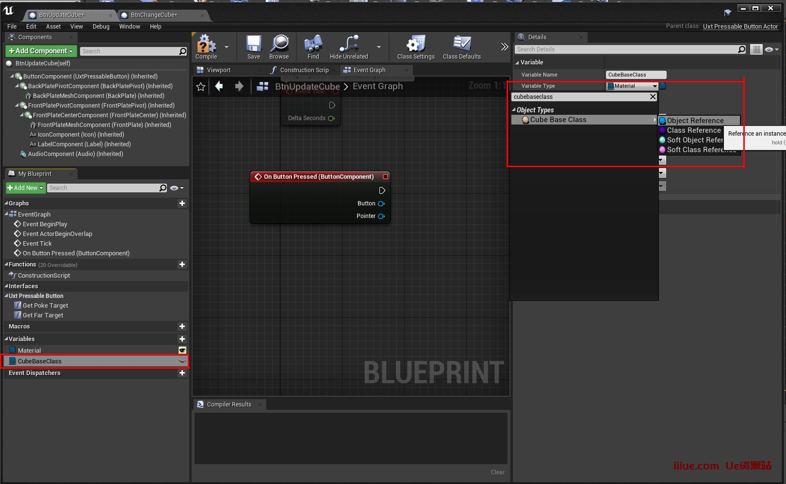 转到“我的蓝图”面板,然后向下滚动到“变量”部分。单击 + 以添加变量。将其命名为“材质”,然后转到“材质”节点的“详细信息”面板,单击“变量类型”下拉列表,搜索“材质”并选择蓝色的“对象参考”选项。