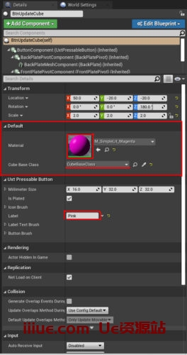 将 BtnUpdateCube 拖放到场景中,然后在“细节”面板中滚动到“变换”部分,并将其放置在 x:50 y:-20 z:-20,z 旋转为 180,比例为 x:2 y:2 z:2。