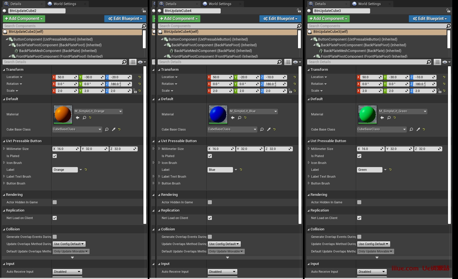 现在复制您的按钮 3 次并移动它们,以便您可以看到它们。将标签更新为蓝色、绿色和橙色,并为每个标签拖动正确的材质并分配 CubeBaseClass。
