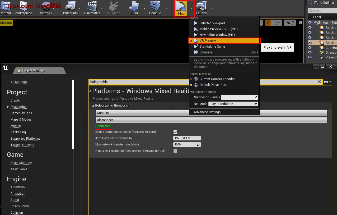 当UE连接到Hololens时,你将看到绿色的连接响应。现在转到播放>>VR预览,您将看到它加载到头戴设备中。