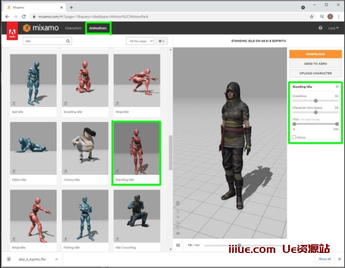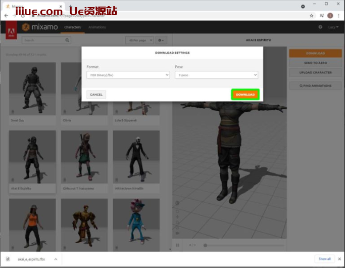 您将在页面顶部看到两个选项卡。角色和动画。 首先进入“字符”选项卡,搜索庞大的数组,直到找到自己喜欢的内容。然后只需单击右上角的橙色下载。