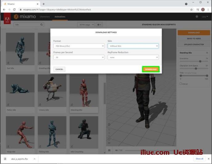 使用以下设置进行下载。我选择不下载皮肤,因为这样我就可以将动画分配给任意数量的角色。